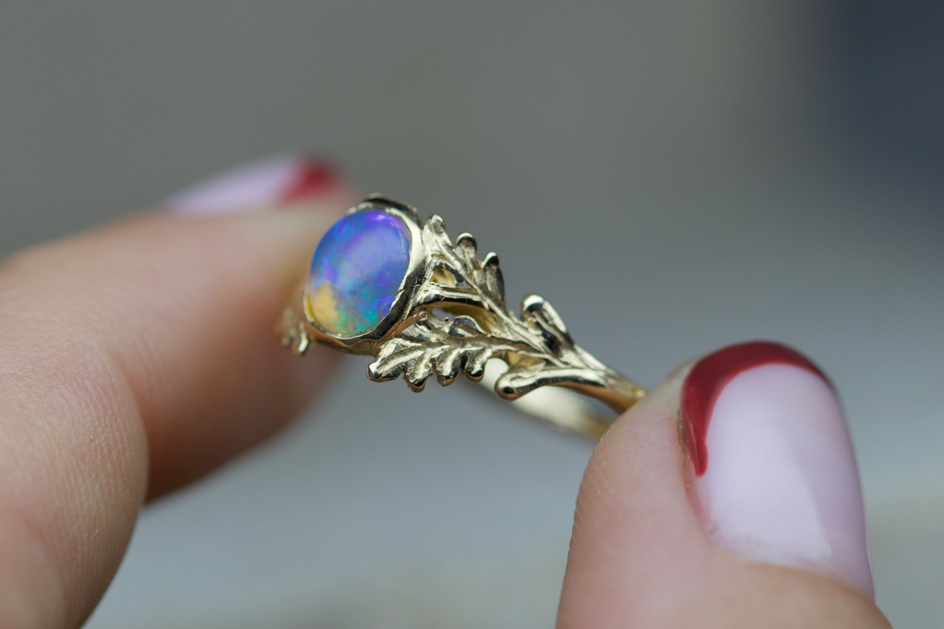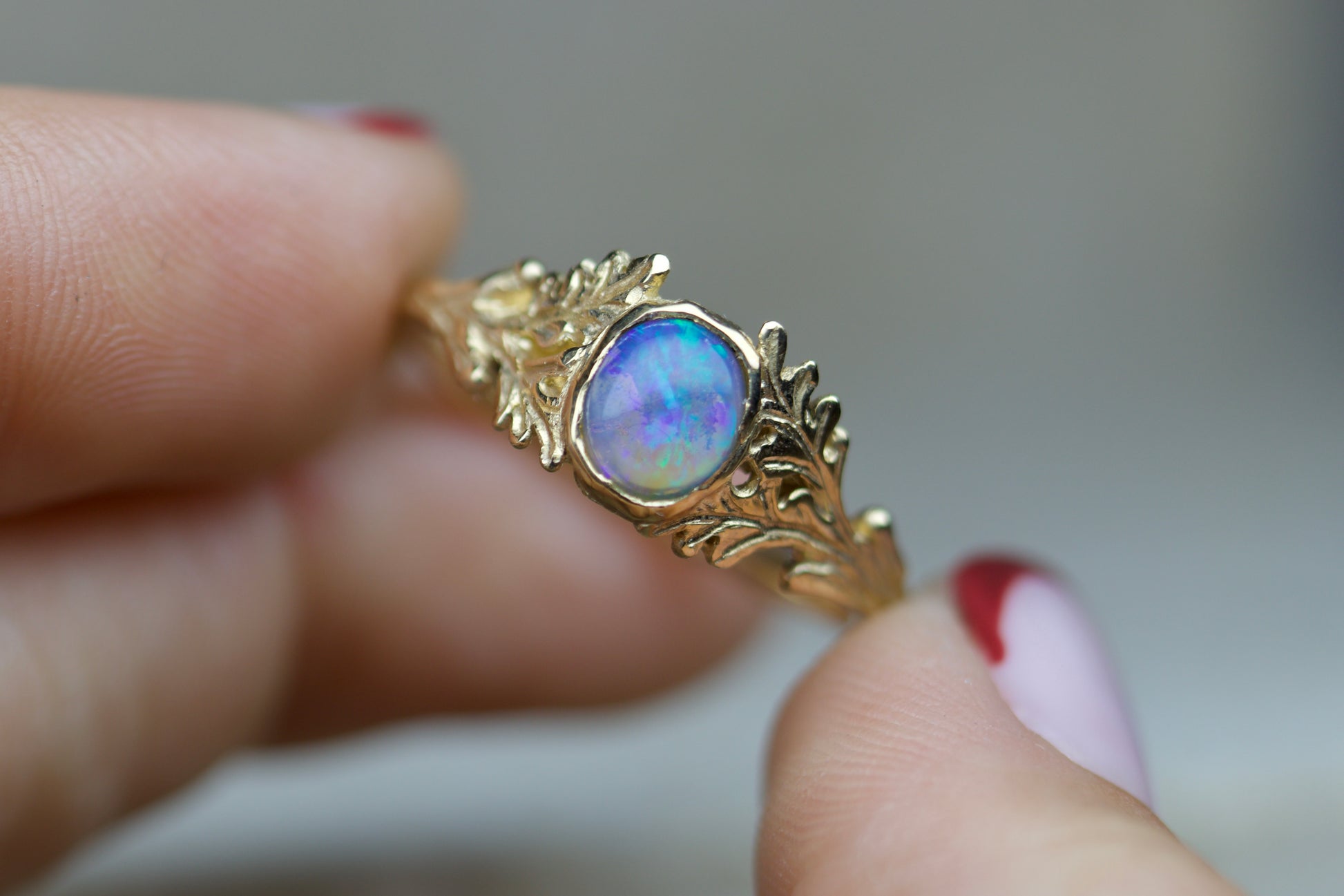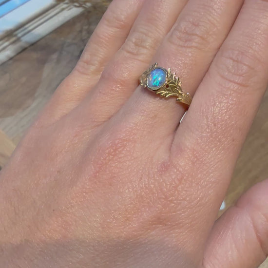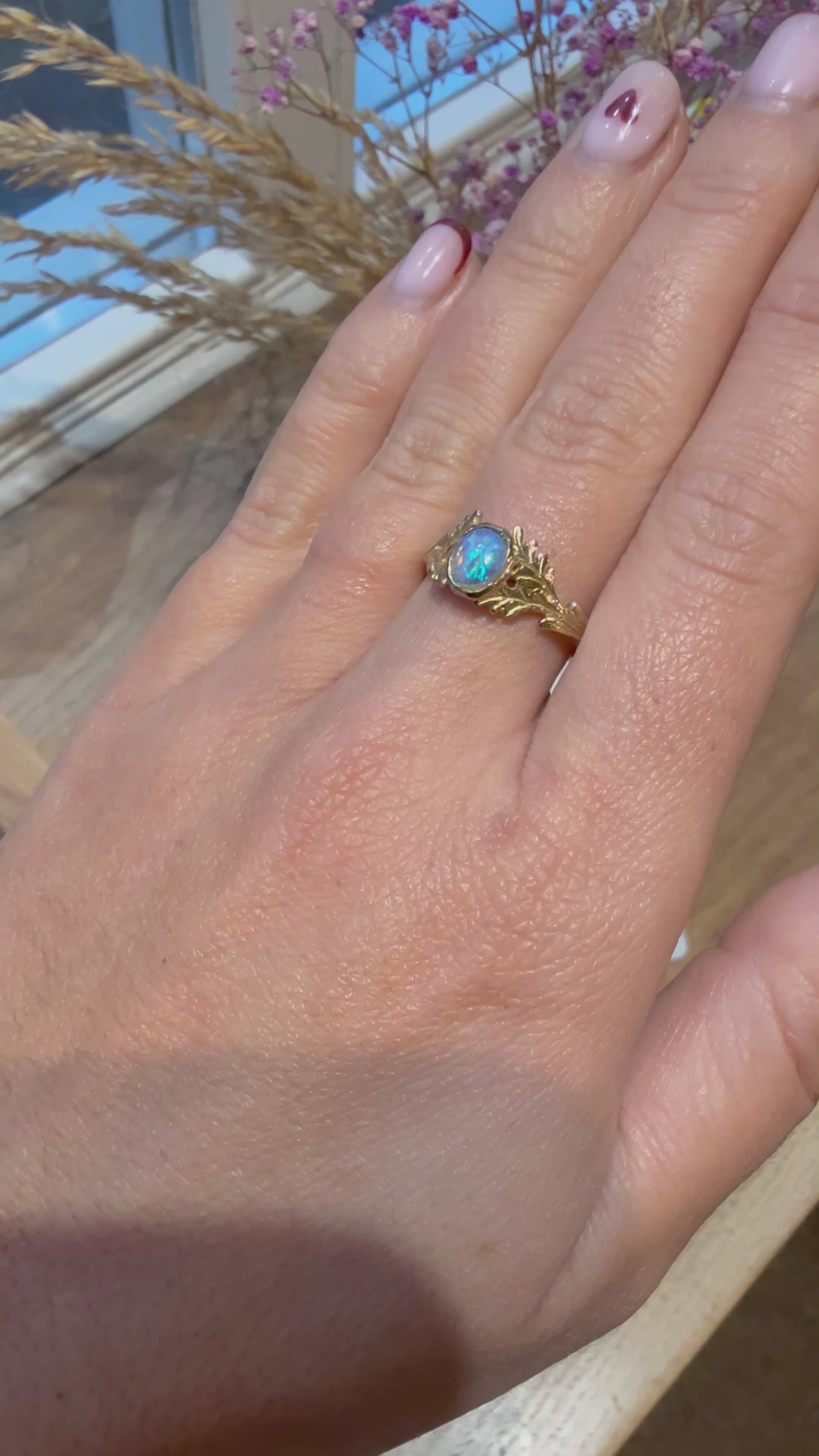 •Bezel set within a decorative oak leaf band, almost encasing the opal itself.