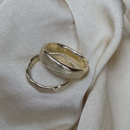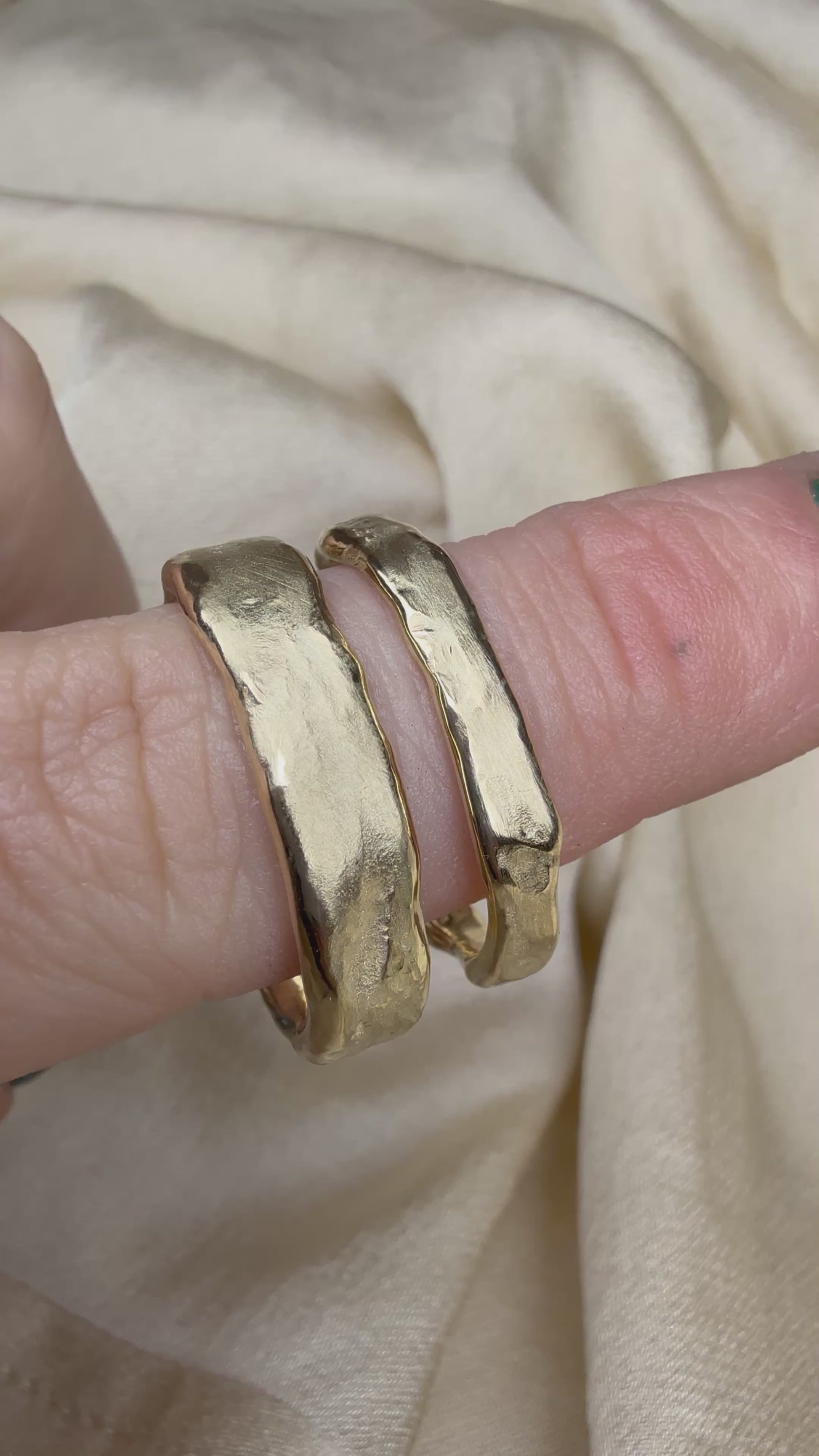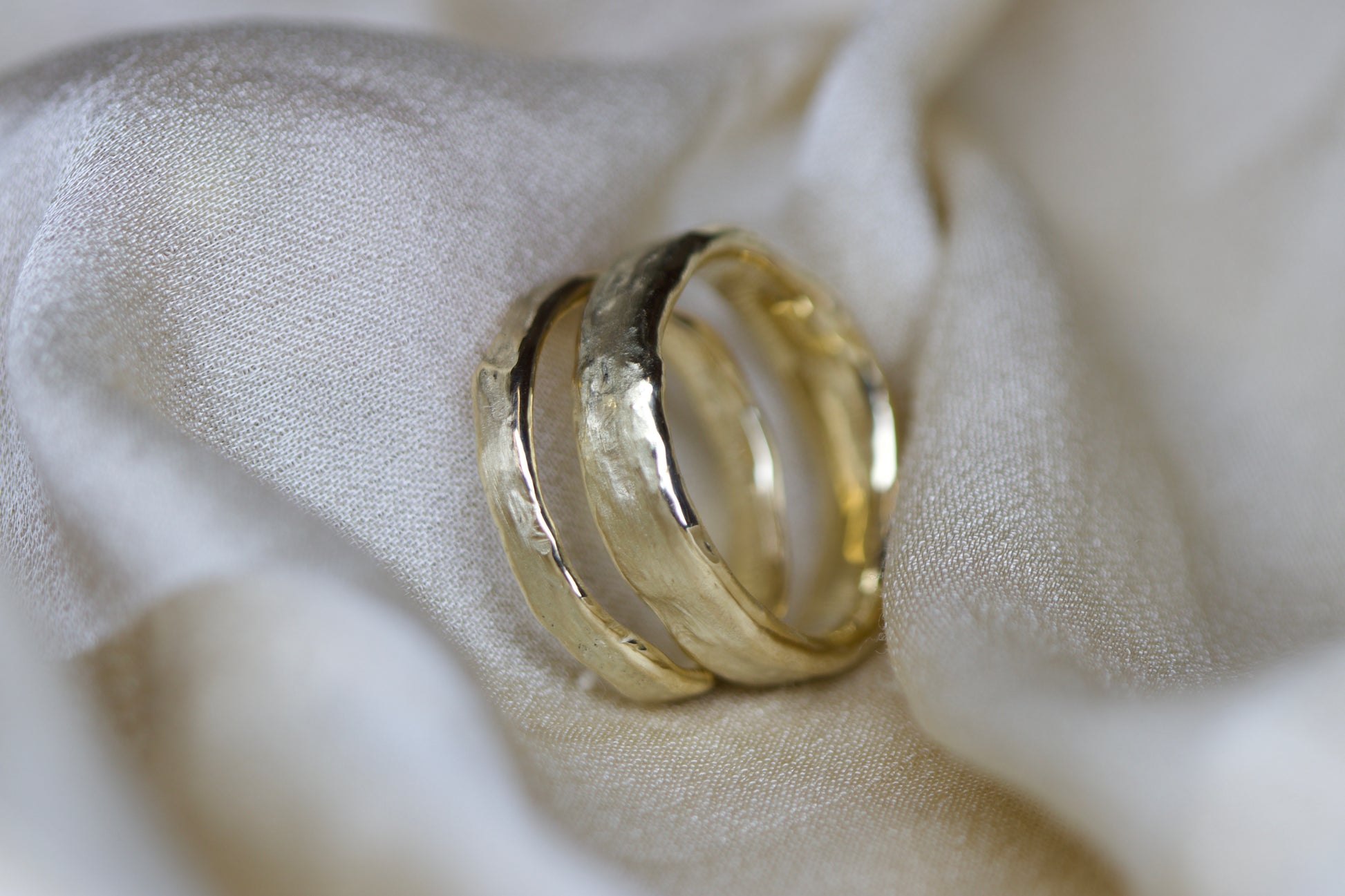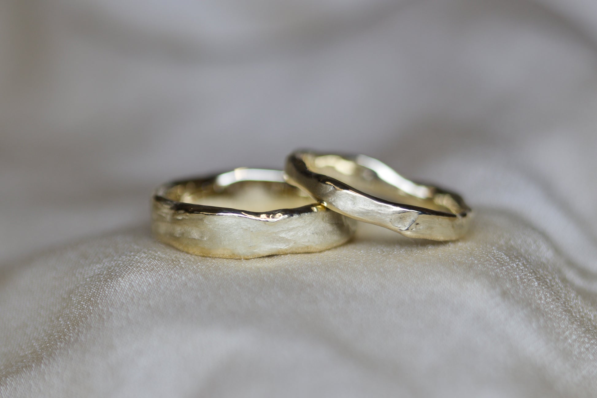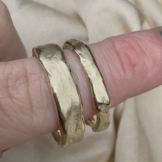 An organic and rustic take on a contemporary wedding set, these bands have been wax carved and then reticulated.