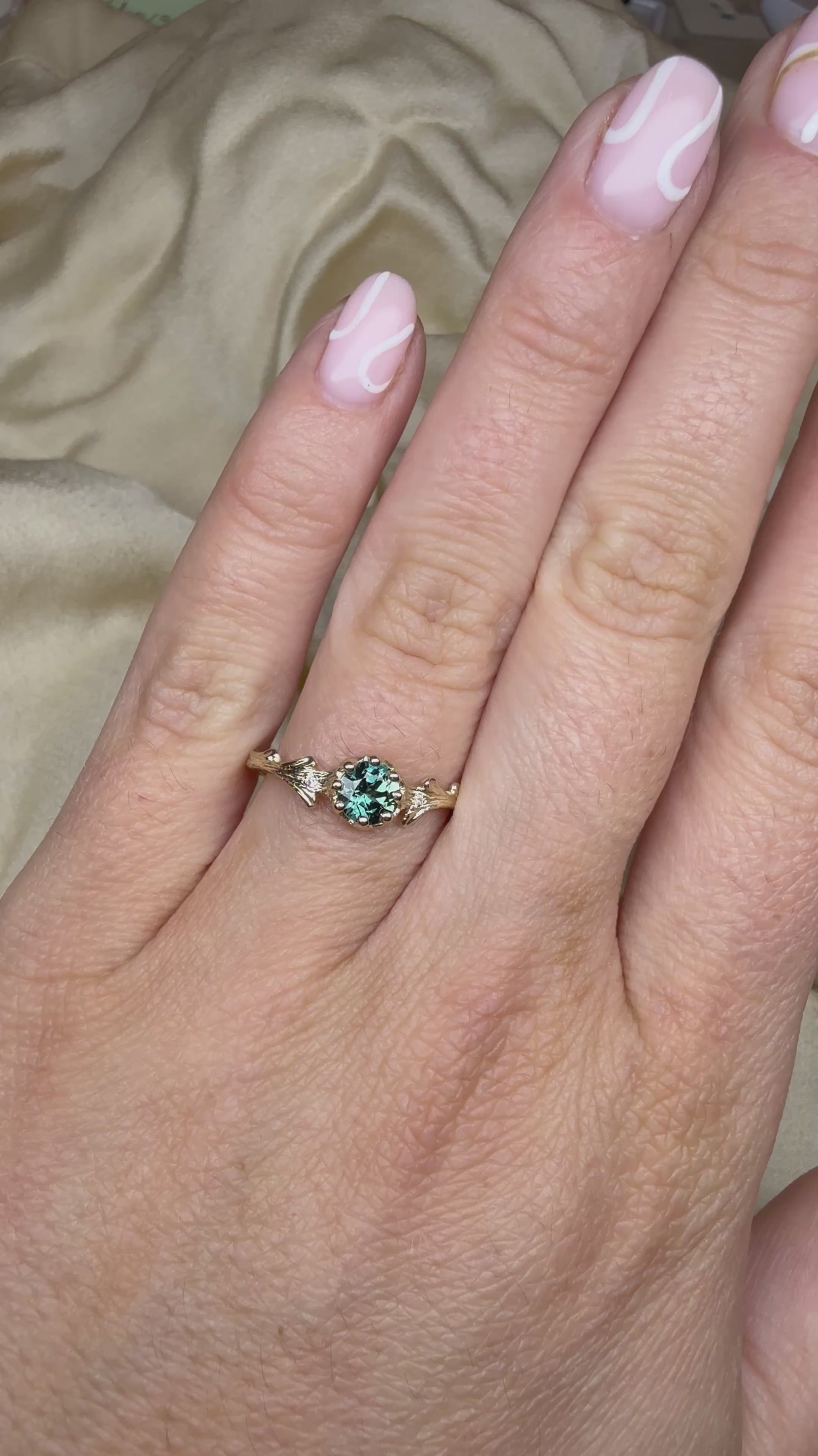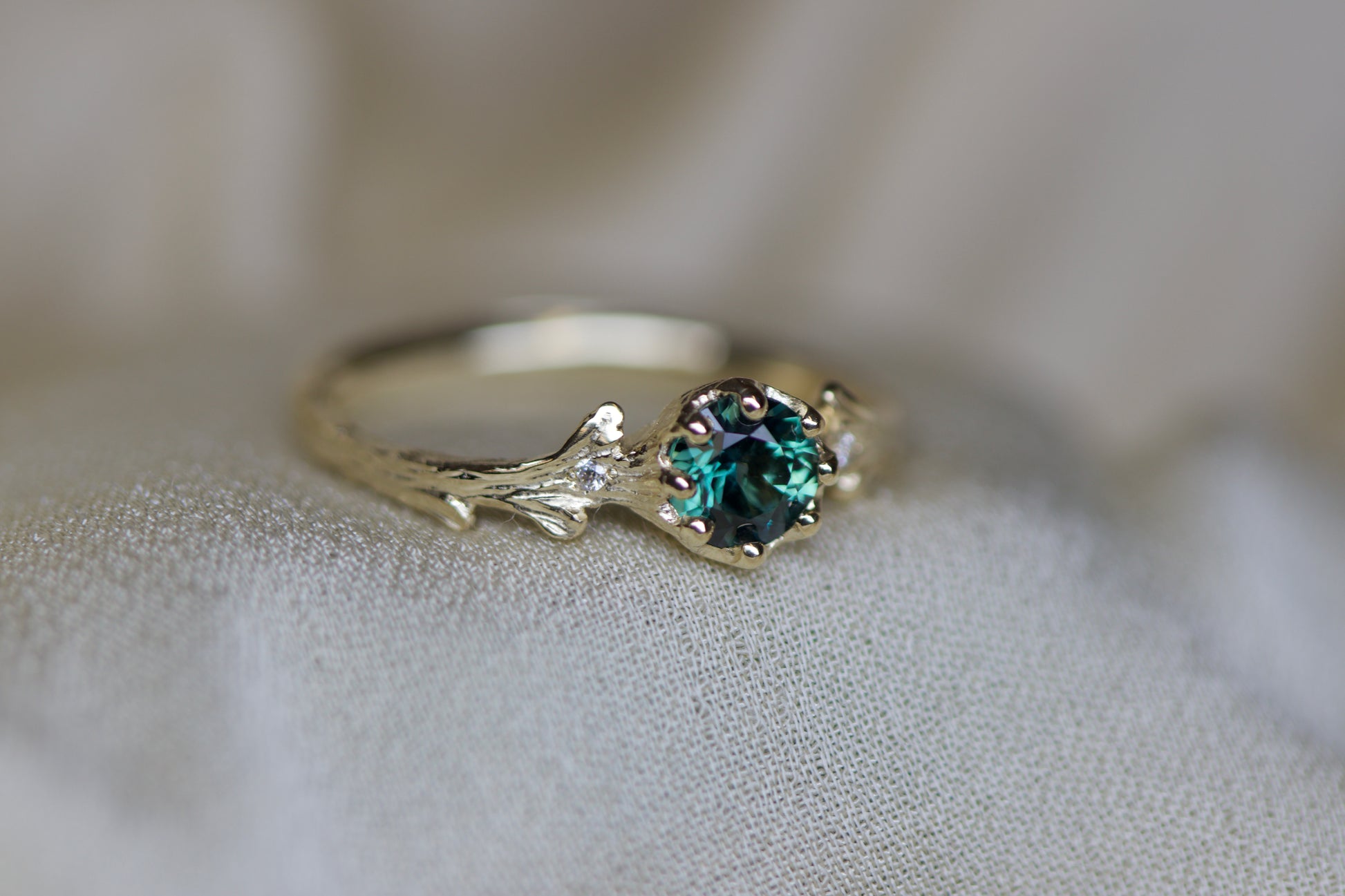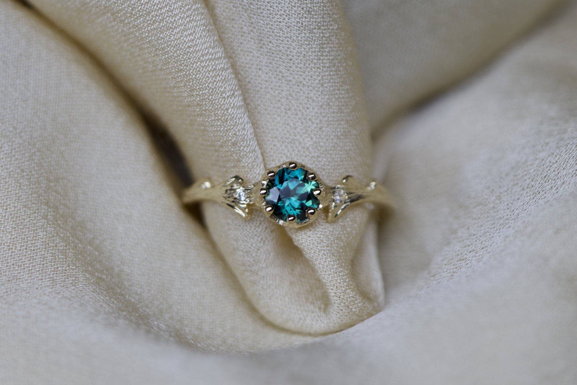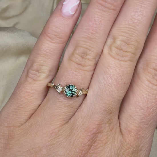 Teal sapphire & Hawthorne ring