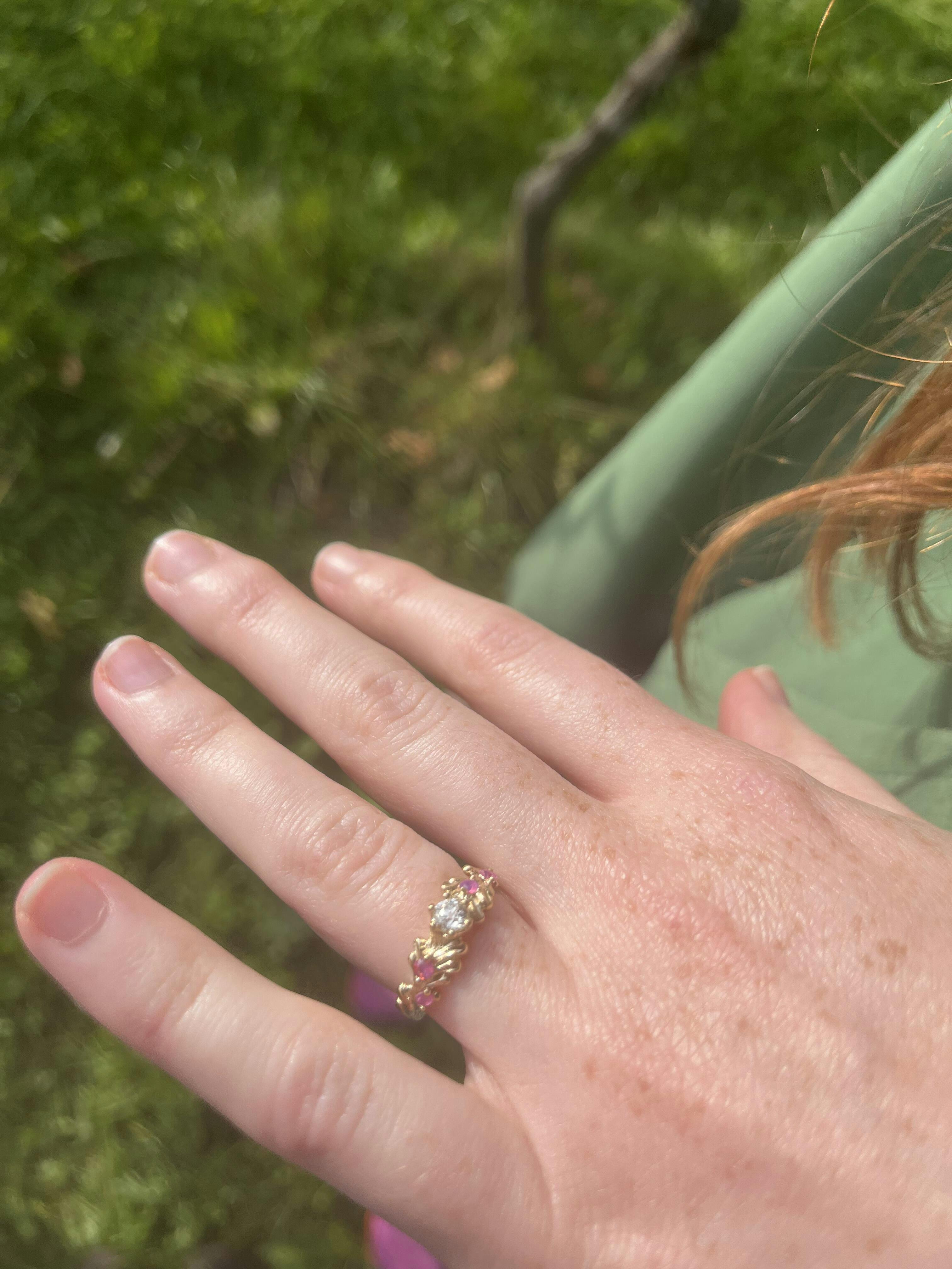 And embellished within the ginkgo details are four 1.5-2mm opalescent pink and Lilic sapphires